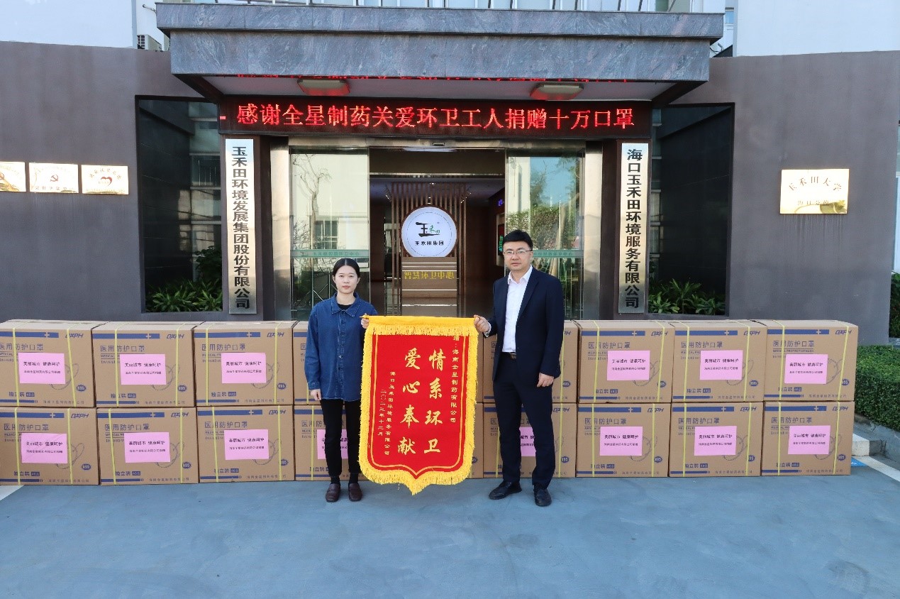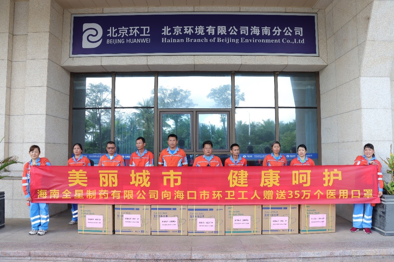 海南全星制藥有限公司向??谑协h(huán)衛(wèi)工人贈(zèng)送35萬個(gè)醫(yī)用口罩